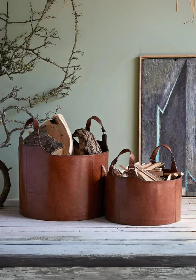 A round log basket is a functional and decorative item used for storing and carrying firewood or logs. leather basket combines functionality and style, providing a durable and attractive solution for storing and transporting firewood. Choose a basket that is well-made, appropriately sized, and complements your home decor for both practicality and visual appeal.